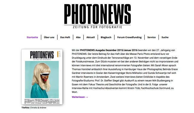 "Unser Ziel, mit PHOTONEWS möglichst breite Kreise anzusprechen, war auch Reaktion auf eine gewisse Ignoranz, die in der Fotoszene zu beobachten ist. Künstlerisch tätige Fotografen, Fotojournalisten, Werbe- und Modefotografen leben häufig in geschlossenen Zirkeln und finden daher kaum Zugang zu den Fotografien anders arbeitender Kollegen. Mit PHOTONEWS versuchen wir verschiedene Bereiche miteinander zu verbinden und die jeweiligen Arbeitsansätze möglichst plausibel zu beschreiben. Entsprechend der Prämisse »von jedem etwas« wird die PHOTONEWS-Struktur Ausgabe für Ausgabe aus möglichst vielfältigen Beiträgen komponiert." Die Redaktion Denis Brudna, Anna Gripp